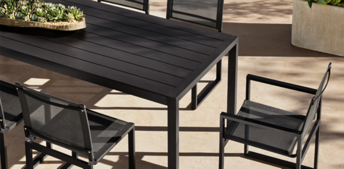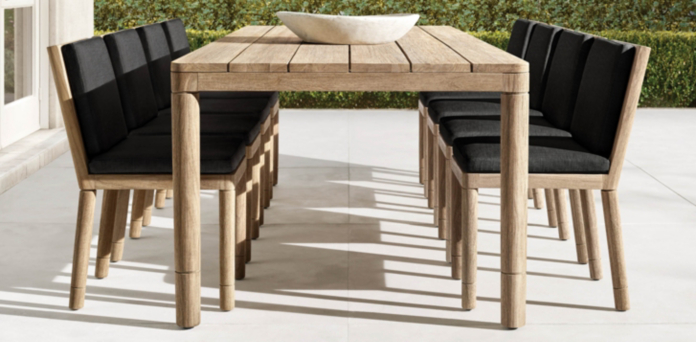 A restoration hardware balmain teak rectangular dining table sits on a teak deck surrounded by gray teak and wicker dining chairs.